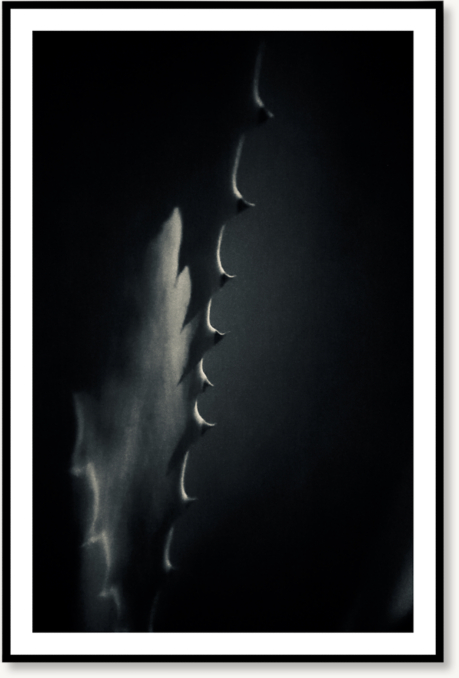 Plant contours are made monumental, dramatic and sensual in Maria V. Cano's photographic studies. Spiked thorns and curved leaf forms emerge from shadows, their edges catching the light to create a striking effect. Beauty and danger combine in a single perception, each finding a complement in the other.